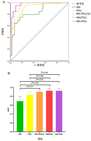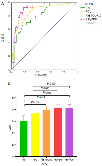 1.4 RRI和PDU评分联合指标本研究选取了三种RRI和PDU评分联合方式,①RRI-RDU/10:参照Contti等[11]研究中RRI和PDU半定量评分的联合方式,为RRI值与PDU半定量评分的1/10相减所得;②RRI/PDU:研究表明PDU评分与RRI具有负相关性[20-21],RRI的水平随着PDU评分的降低而升高,因此选用RRI与PDU评分的比值作为两者联合的一种方式,通过RRI除以PDU评分得出;③RRI+PDU是通过logistic回归分析得出的RRI与PDU评分对发生AKI 3期的联合预测概率。