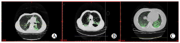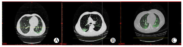 | A~C分别代表第3、5、7天;绿色为所选热区(CT值-500 HU至-101 HU) 图 1 生存组同一病例第3、5、7天GGOs改变 Fig 1 Changes of GGOs on the 3rd, 5th and 7th day in the same person of the survival group |