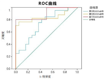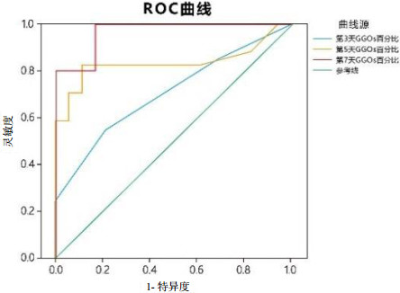 | 图 4 PQ中毒患者第3、5、7天GGOs体积占比ROC曲线 Fig 4 The ROC curve of V%GGOs on the 3rd, 5th and 7th day with PQ poisoning patients |