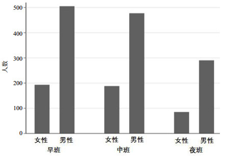 | 图 1 各个班次就诊人数及性别比例 Fig 1 Distribution and sex ratio of the trauma patients in the three shifts |