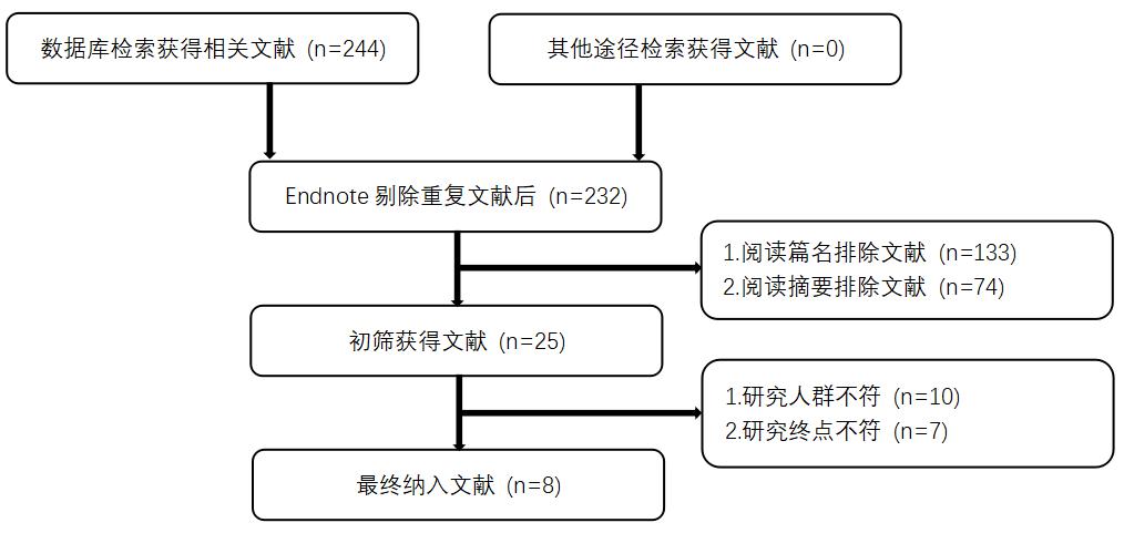 2 结果 2.1 文献检索结果初步检索文献244篇,经逐步筛选,最终纳入8篇文献[8-15]。文献筛选流程见图 1。