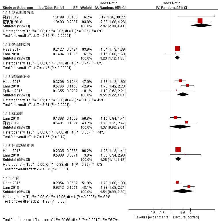 本研究有2篇文献[8, 14]报道了外周动脉疾病是ACS患者PCI术后再入院的影响因素。外周动脉疾病和ACS患者PCI术后再入院之间的机制尚不完全清楚。然而有一些研究表明,外周动脉疾病和血液流变和炎症因子有关,这可能增加了ACS患者PCI术后再入院的风险[23-25]。