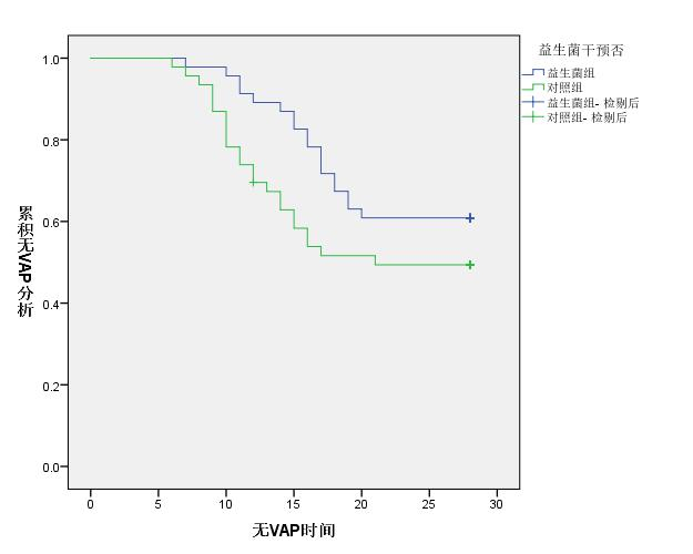 通过Log-Rank test分析显示益生菌组的无VAP时间明显长于对照组,差异有统计学意义(P<0.05),见图 1;通过校正APACHEⅡ评分、年龄后,COX比例风险模型分析示对于28 d VAP发病益生菌干预组与对照组的RR值分别为0.18(95% CI:0.12~0.74,P=0.025)和0.21(95% CI:0.19~0.95,P=0.042)。