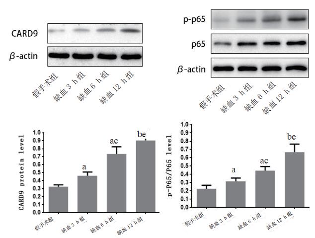 2 结果 2.1 CARD9表达情况及NF-κB活性改变Western blot结果显示,与假手术组相比(0.325±0.011),缺血3 h(0.462±0.019)、6 h(0.735±0.036)和12 h组(0.903±0.024)中CARD9表达均升高,差异有统计学意义(t=2.017, P=0.036; t=4.645, P=0.003; t=7.1829, P=0.001);与缺血6 h组相比,缺血3 h和12 h组中CARD9表达分别降低和升高,差异有统计学意义(t=2.833, P=0.031;t=2.145, P=0.035)。NF-κB活性采用目前学界常用的p-NF-κBp65/NF-κBp65来说明,与假手术组相比(0.227±0.016),缺血3 h(0.316±0.017)、6 h(0.445±0.021)和12 h组(0.671±0.039)中NF-κB活性均升高,差异有统计学意义(t=1.975, P=0.041; t=2.518, P=0.016; t=3.032, P=0.008);与缺血6 h组相比,缺血3 h和12 h组中NF-κB活性分别降低和升高,差异有统计学意义(t=2.256, P=0.032; t=2.935, P=0.009)。提示CARD9表达及NF-κB活性在脑组织缺血12 h内随时间升高。见图 1和表 1。