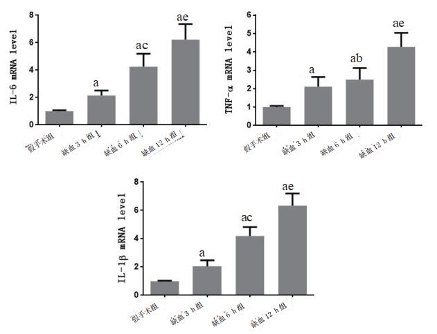 | 与假手术组比较,aP < 0.01;与缺血3 h组比较,bP < 0.05,cP < 0.01;与缺血6 h组比较,dP < 0.05,eP < 0.01 图 2 各组炎症因子mRNA的相对表达情况 Fig 2 The relative expression of inflammatory factors mRNA in each group |