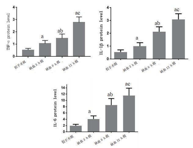| 与假手术组比较,aP < 0.01;与缺血3 h组比较,bP < 0.01;与缺血6 h组比较,cP < 0.01。 图 3 各组炎症因子表达情况 Fig 3 The expression of inflammatory factors in each group |