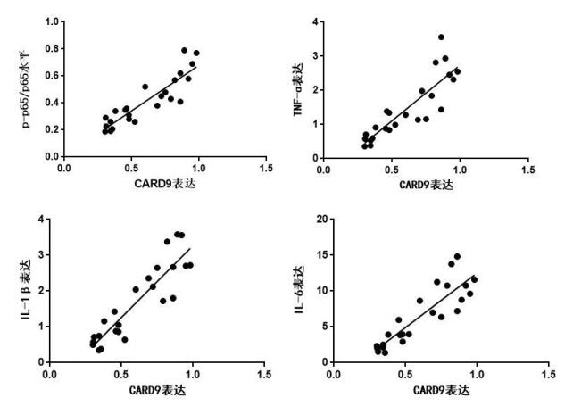 将各组CARD9与NF-κB活性(p-p65/p65)、炎症因子TNF-ɑ、IL-1β、IL-6蛋白表达结果分别绘制散点图后,发现两两之间存在线性趋势,结果见图 4,因此进行Pearson相关分析,结果显示CARD9与NF-κB活性、TNF-ɑ、IL-1β、IL-6均存在正相关(r=0.894, P=0.001; r=0.747, P=0.008; r=0.810, P=0.001, r=0.773, P=0.007)。