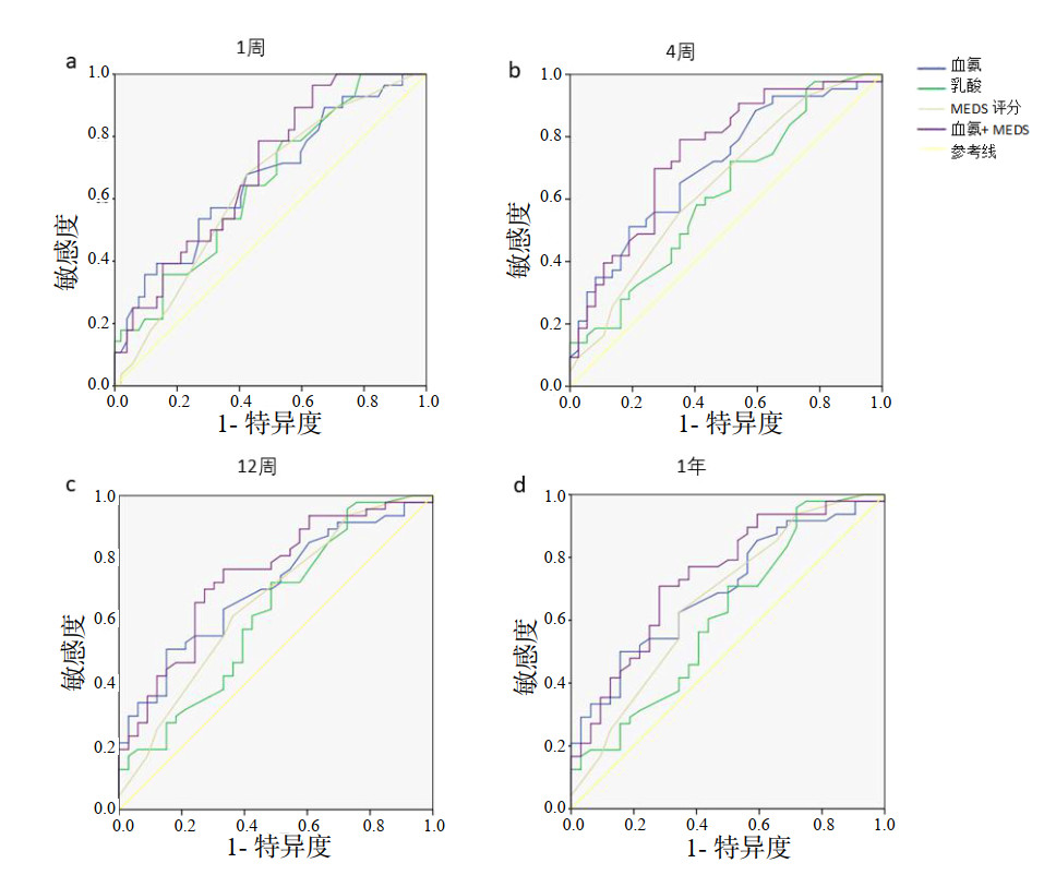 图 1 血氨、MEDS、乳酸及血氨联合MEDS在1周、4周、12周及1年时,预测脓毒症患者病死率的受试者工作特征曲线下面积 Fig 1 Area under ROC Curve for predicting mortality in sepsis patients at 1 week, 4 weeks, 12 weeks, and 1 year for serum ammonia, MEDS, lactic acid and blood ammonia combined with MEDS |