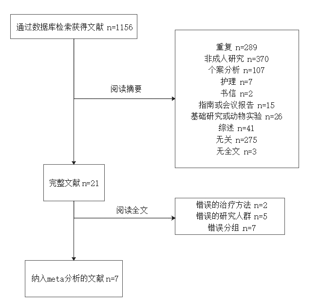 2 结果 2.1 文献检索结果共检索文献1 156篇,经过阅读摘要或全文后排除1 149篇,7篇完整文献纳入Meta分析。纳入的文献均为英文回顾性病例对照研究;发表时间2014—2019年;样本量8~151例,共计350例,其中男性229例,女性121例,生存患者89例,死亡患者261例,病死率36.08%~92.96%;发表地区均为亚洲。文献检索流程见图 1。纳入文献的基本资料见表 1。