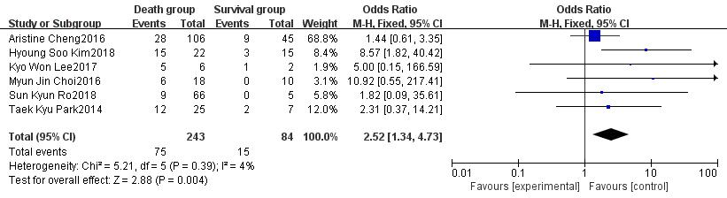2.2.2 病史纳入的研究均未发现患者死亡与既往史,包括糖尿病(OR=0.99,95%CI: 0.55~180,P=0.98)、高血压病(OR=0.94,95%CI: 0.52~1.68,P=0.83)、慢性肾脏病(OR=0.38,95%CI: 0.11~1.34,P=0.13)有密切关系,但是涉及心脏骤停史的研究均指出心脏骤停是患者死亡的相关因素,其中有2项研究[6, 8]发现心脏骤停是患者死亡的独立危险因素,其中Park[6]的研究发现CPR的时长是患者死亡的独立危险因素。经文献合并后发现心脏骤停史(OR=2.52,95%CI: 1.34~4.73,P=0.004)与CPR时间(OR=16.04,95%CI: 8.68~23.4,P < 0.01)为患者死亡重要的危险因素,见图 2~3。