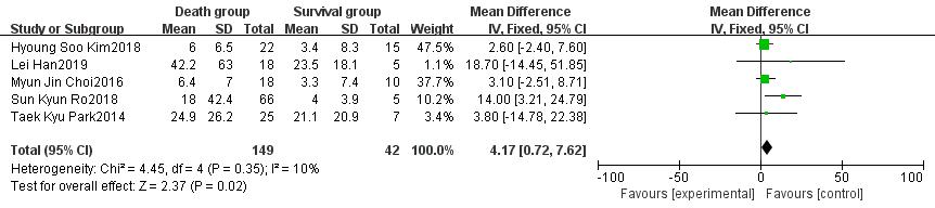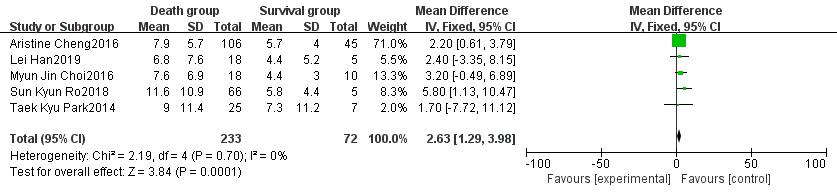 白细胞计数、肌酐、动脉血pH、乳酸均为ECMO使用前24 h内采血测得。其中Kim[4]的研究发现pH是患者死亡的独立危险因素,但经过文献合并后不支持该结果(OR=-0.09,95%CI: -2.99~2.80,P=0.95)。纳入分析的5项研究均发现乳酸水平与患者死亡密切相关,Meta分析的结果支持乳酸水平升高是脓毒性休克患者死亡的重要危险因素(OR=2.63,95%CI:1.29~3.98,P < 0.01),见图 4。而白细胞计数(OR=2.28,95%CI: -3.20~7.76,P=0.41)、肌酐水平(OR=0.21,95%CI: -0.66~1.07,P=0.64)与患者死亡无明显关联。