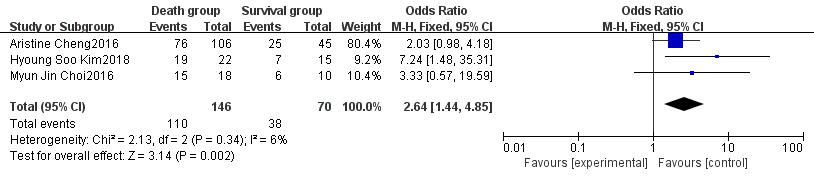 2.2.5 ECMO相关指标Cheng等[8]的研究发现患者发生休克至使用ECMO的时间与死亡密切相关,经合并后发现该时间为患者死亡的重要危险因素(OR=4.17,95%CI:0.72~7.62,P=0.02),见图 5。独立的研究和Meta分析都显示使用ECMO的时长与患者死亡无明显关联。有两项研究[8, 10]发现V-A模式是患者死亡的独立危险因素,经合并后支持该结果(OR=2.64,95%CI: 1.44~4.85,P=0.002),见图 6。