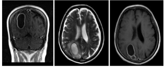 1 资料与方法患者,63岁男性,诊断“肾病综合征”10年余,长期口服激素治疗,病情反复发作。2019年11月8日因全身浮肿加重,伴头痛、视物模糊、四肢乏力、行走不能入院。入院时查体:T 36.8℃,P 63次/min,R 20次/min,BP 149/91 mmHg(1 mmHg=0.133 kPa),神志清,精神疲乏,全身浮肿。双侧瞳孔等圆等大,直径约2.5 mm,对光反射灵敏。双肺呼吸音粗,双肺未闻及干湿性啰音。心率63次/min,律齐,未闻及杂音。左上肢、双下肢肌力Ⅴ-级,肌张力正常;右上肢肌力Ⅳ级,肌张力升高。脑膜刺激征阴性,双下肢巴氏征未引出。四肢可见癣样皮疹。头颅CT(图 1)示右顶叶低密度灶,占位性病变。头颅增强MR(图 2)示右侧顶/枕叶多个囊性灶,考虑脓肿。入院后患者有反复发热,精神状态差,综合考虑右侧顶枕部脑脓肿,于2019年11月14日在全麻下行右侧顶枕部钻颅脑脓肿穿刺外引流术,术中抽取脓液培养阴性,予经验性使用万古霉素联合美罗培南抗感染治疗。术后患者依然反复高热,精神状态变差,考虑抗感染效果不佳。多次进行引流液及脑脊液培养均为阴性,经患者及家属同意后采集脑脊液进行二代基因测序(深圳华大基因科技有限公司,广东深圳),结果提示皮疽奴卡菌。诊断为原发性脑奴卡菌脓肿,予调整为复方磺胺甲噁唑口服,联合美罗培南静脉滴注,治疗2 d后体温逐步降低,意识状态好转。后期因家属因素,自动出院回当地治疗。本病例资料已获得患者知情同意。