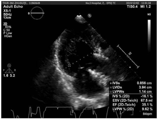 患者行Impella支持期间每日心超提示:左心功能逐步恢复。至辅助第5天时,LVEF达到39%。第9天,血管活性药减停,患者生命指征平稳,心脏基础瓣膜疾病以及ICU机械通气时间较长导致的肺部感染已基本控制。心超示EF约为35%~40%。达到撤机指征,撤除Impella。41 d后,患者于2019年10月18日康复出院,心超(图 2)示LVEF 35.8%,LVEDV 110 mL,LA 3.37 cm。出院后2个月心超(图 3)随访,LVEF 41.1%,LVEDV 85.7 mL。