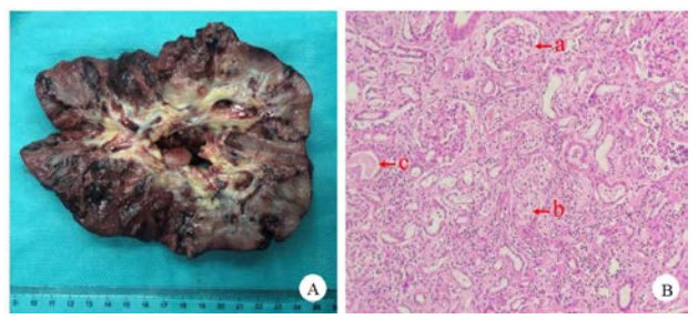 | 图 2 患者右侧肾脏大体标本及组织切片(A:右侧肾脏大体标本,可见肾脏有多处积脓,局部皮质糜烂;B:肾组织切片标本,a为基本正常肾小球,b为肾小管内炎性细胞及组织碎片,形成管型;c为硬化的肾小球,HE×400) |