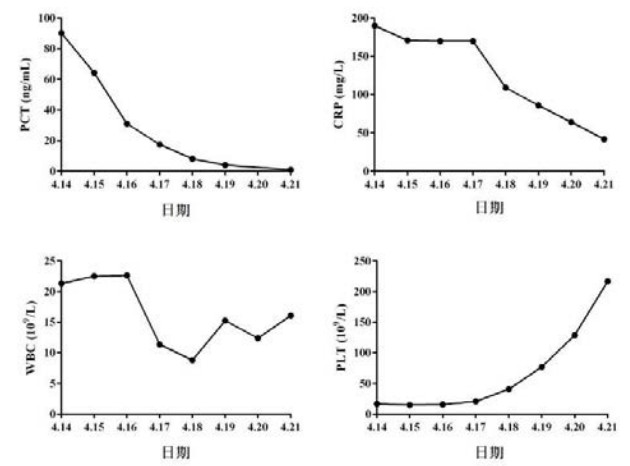 | 图 3 患者感染指标及血小板变化趋势[4月15日术后,降钙素原(PCT)、C反应蛋白(CRP)及白细胞(WBC)呈明显下降趋势,血小板(PLT)逐渐升至正常] |