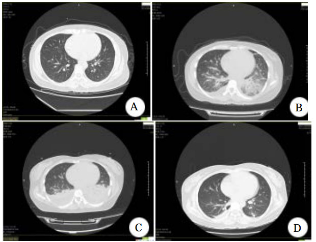 | 图 1 患者胸部CT(A:入院前;B:入院第1天;C:入院第4天;D:入院第7天) |