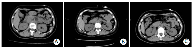 | 图 2 患者腹部CT(A:入院第1天;B:入院第4天;C:入院第7天) |