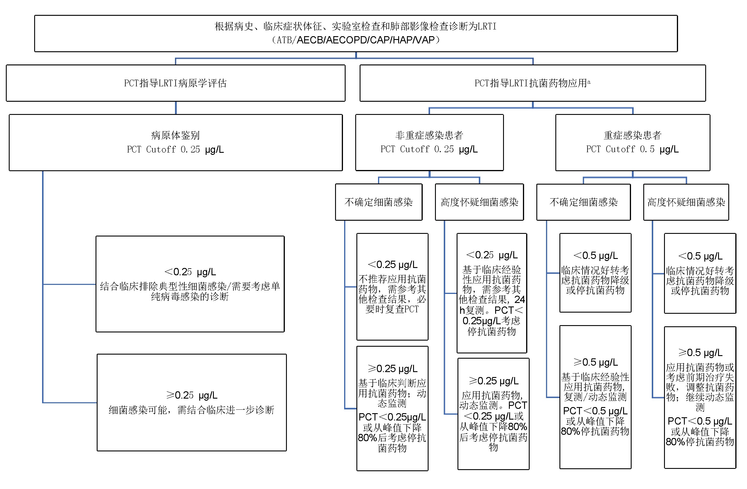 【推荐2】排除典型细菌性LRTI的诊断阈值采用PCT 0.25 μg/L,此阈值同时可作为启用和终止抗菌药物治疗的参考指标。