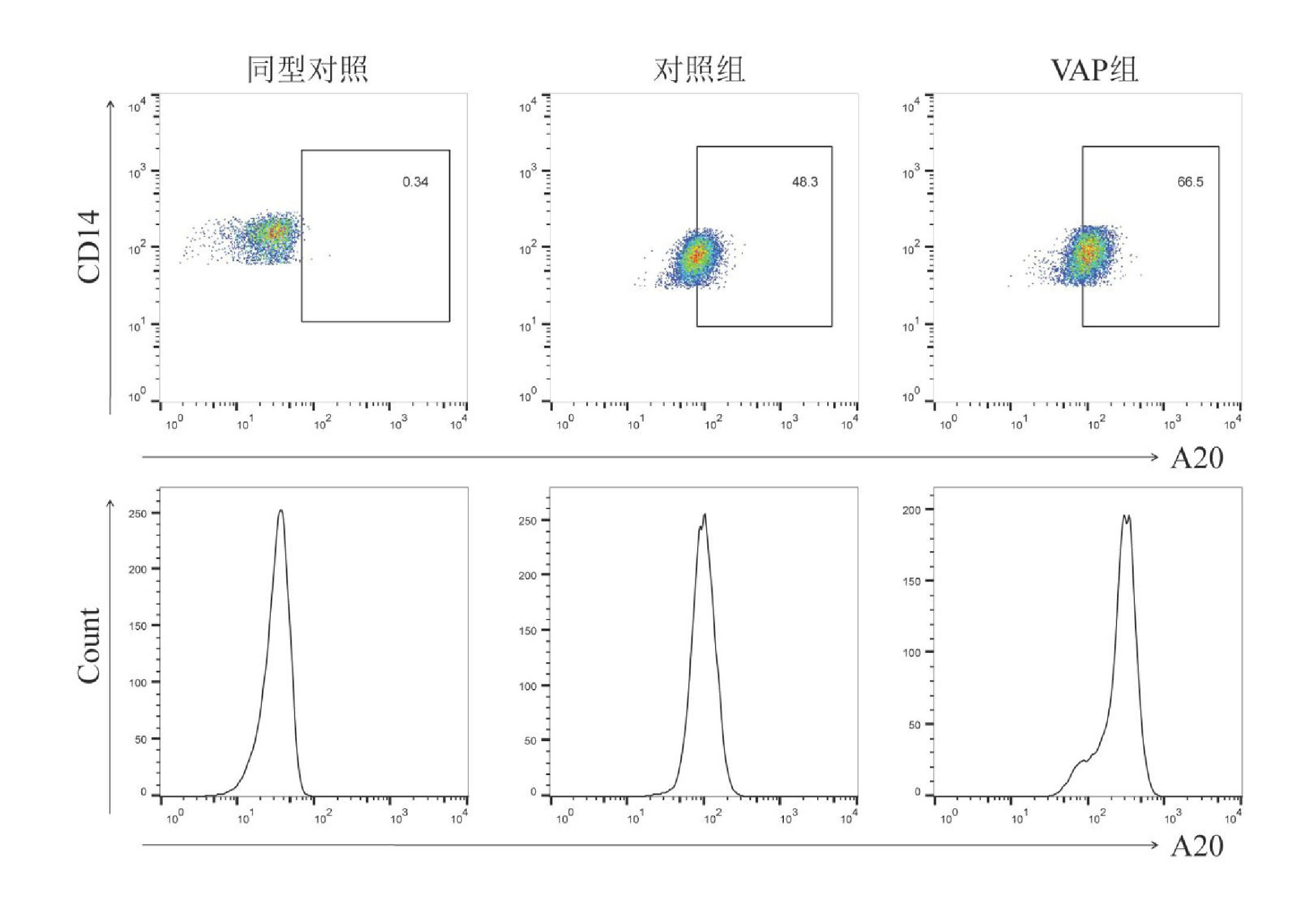 | 图 1 对照组和VAP组外周血CD14+单核细胞中A20阳性细胞和A20 MFI分析的典型流式图 Fig 1 Representative flow cytometry analysis for A20 positive cells and A20 mean fluorescence intensity in control group and VAP group |