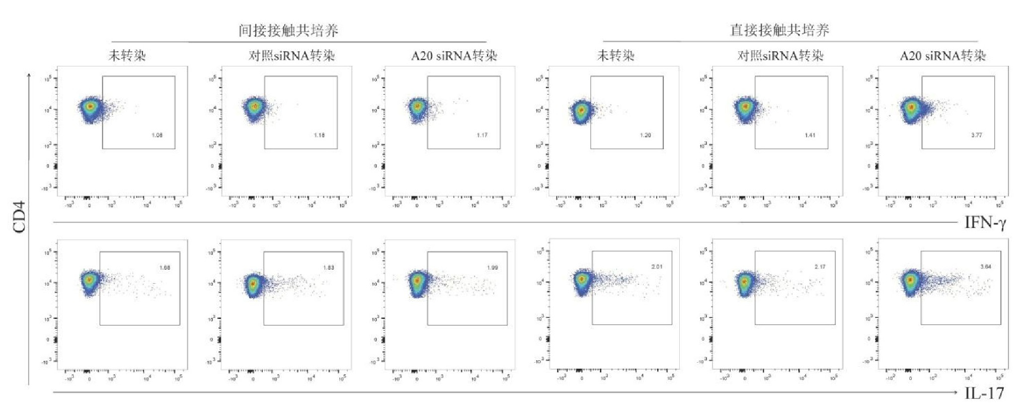 | 图 2 未转染、对照siRNA转染及A20 siRNA转染CD14+单核细胞与自体CD4+T细胞间接/直接接触共培养后CD4+T细胞分泌IFN-γ和IL-17的典型流式图 Fig 2 Representative flow cytometry analysis for IFN-γ- and IL-17-secreting CD4+ T cells in direct/indirect contact co-culture system of CD14+ monocytes and autologous CD4+ T cells among untrasnfection, control siRNA transfection, and A20 siRNA transfection |
