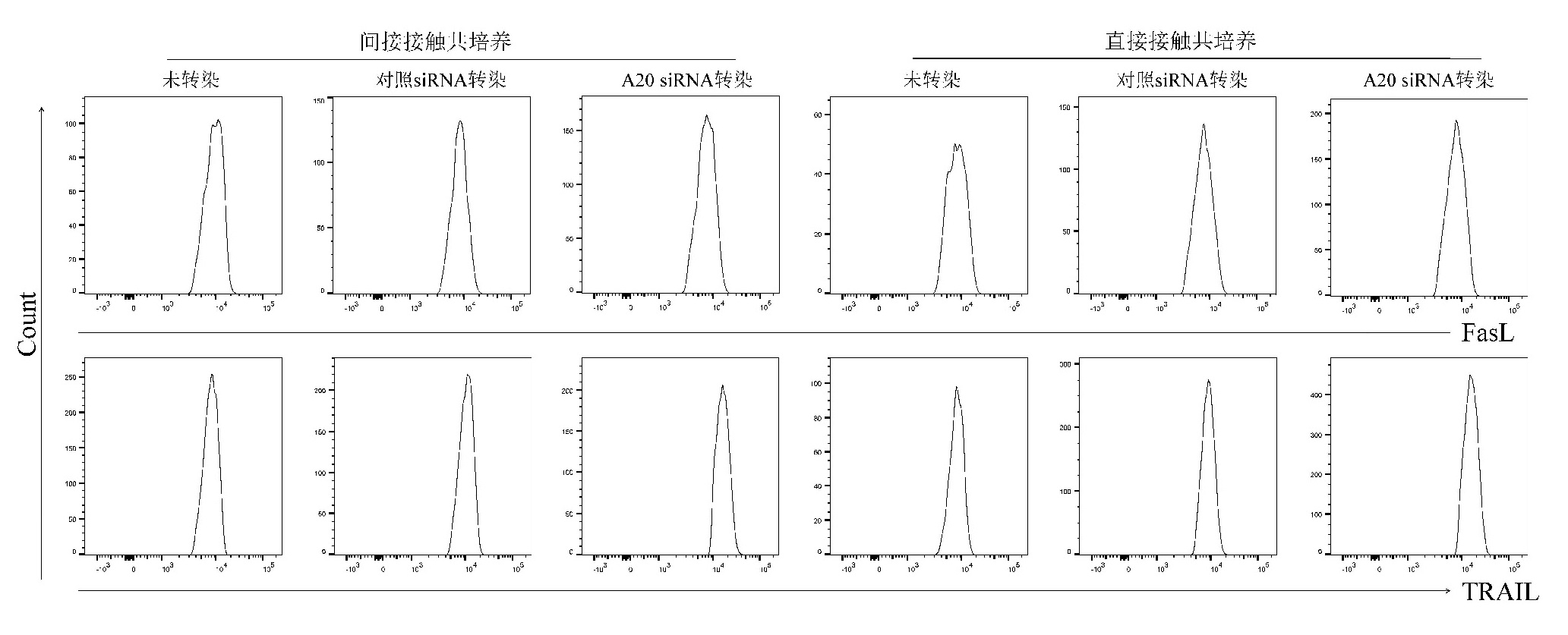 | 图 3 未转染、对照siRNA转染及A20 siRNA转染CD14+单核细胞与NCI-H889细胞间接/直接接触共培养后FasL和TRAIL MFI分析的典型流式图 Fig 3 Representative flow cytometry analysis for FasL and TRAIL MFI in direct/indirect contact co-culture system of CD14+ monocytes and NCI-H889 cells among untrasnfection, control siRNA transfection, and A20 siRNA transfection |