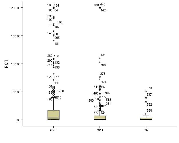 综上,本研究表明,PCT能够提供BSI患者可能的病原学方面的额外信息,尤其是较高的PCT水平往往提示GNB菌血症可能。