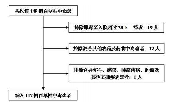 1.1 一般资料回顾性选取2013年12月年至2018年10月收治于南昌大学第一附属医院的急性PQ中毒患者117例,研究对象均有明确口服中毒史、临床症状及符合PQ中毒诊断标准。随访至截止时间。主要终点事件为全因死亡。纳入标准:①中毒至入院时间≤24 h;②年龄≥14岁。排除标准:①服毒时间不详;②混合其他农药或药物中毒;③怀孕期服毒;④近期合并其他感染;⑤慢性阻塞性肺疾病(慢性支气管炎、肺气肿等);⑥血液病;⑦长期服用免疫抑制剂(糖皮质激素);⑧肿瘤;⑨合并心、脑、肾、肝等重要脏器基础疾病;⑩资料缺失或失访。具体流程见图 1。