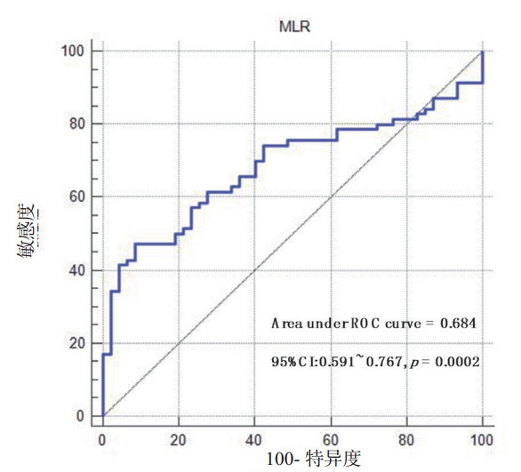 ROC曲线结果如图 2所示,确定MLR预测全因病死率的最佳截断值为0.61,曲线下面积(area under the curve,AUC)为0.684 (95%CI: 0.591~0.767,P=0.0002),敏感性为47.14%,特异性为91.49%。