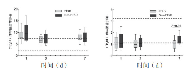 PTSD组在创伤后7 d内的NLR值持续增高;非PTSD组呈明显下降趋势,创伤后第7天NLR值明显低于入院当天(P= 0.001)。见图 2。