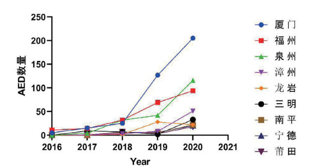 2.1.2 福建省AED铺设数量与各地市城市发展情况及人均可支配收入相关性(1) 收集《中国城市综合发展指数2018》、《福建省2020年统计年鉴》数据(表 1)。(2)相关性分析提示各地市AED铺设数量与城市综合发展指数及人均可支配收入均呈明显正相关(表 2)。(3)福建省各地市AED铺设时间:2016-2020年间福建省各地市AED数量逐年上升(表 3),尤其是在2019年和2020年,均出现了较大幅度的增长(图 1)。(4)福建省AED铺设资金来源:福建省AED数量总计1 051台,资金来源以事业单位、卫健委、红十字会为主(表 4)。(5)福建省各地市AED铺设布局:福建省各地市AED数量总计1 051台,以医疗机构、教育机构为主。(表 5)。