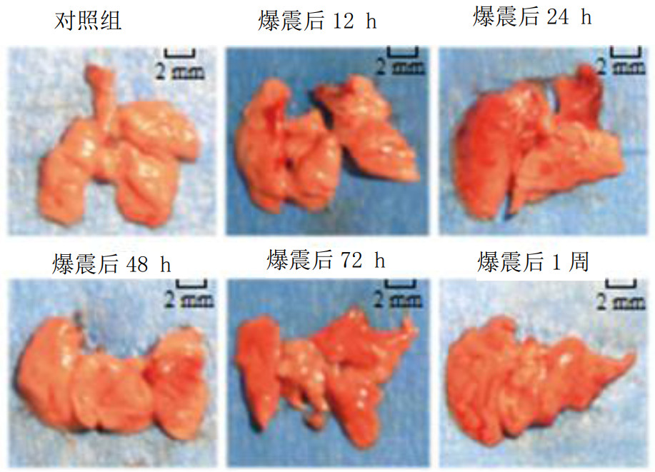 2 结果 2.1 肺组织大体观察肺爆震伤模型建立后,如图 1所示在12 h可观察到小鼠肺的大体外观有肿胀,表面有散在出血点,而对照组外观结构完整,未见明显变化;而后,肺组织表面出血点增多,呈片状分布,其中以24 h最为严重;在72 h肺肿胀、出血情况均有所减轻;在1周时肺大体外观基本恢复同对照组。
