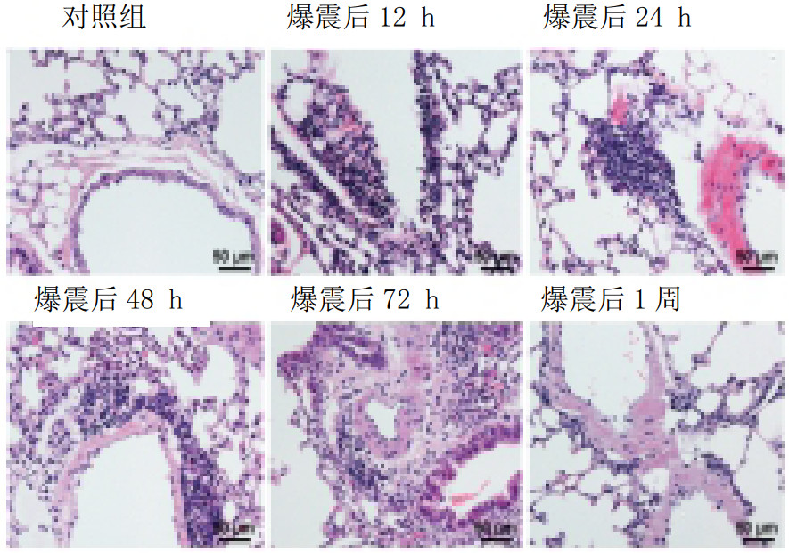 本研究采用自主研发的精准爆震装置对小鼠进行胸部爆震,与其他常规装置相比,其具有操作简单、可重复作用部位较准确及过程可控等优点,能较好地模拟临床患者的损伤特点[5-7]。在前期研究中,笔者明确了不同程度小鼠肺损伤所需冲击波强度范围,成功率高达90%以上[8]。因此在本实验中,为保持爆震组小鼠存活率,便于后续研究观察,选择了单次低强度爆震。建模后,爆震组小鼠出现肺泡正常组织结构消失、肺泡腔内出血、炎细胞浸润、肺间质渗出液增多、肺泡壁增厚及肺泡腔萎陷融合等典型急性肺损伤病理改变[9]。因此,可以确定小鼠肺爆震伤模型建立成功。