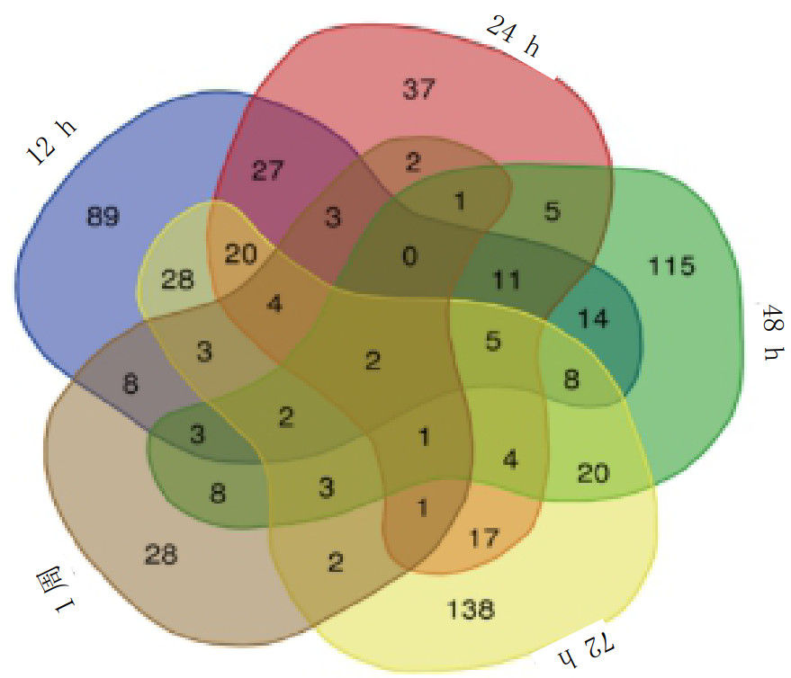| 蓝色代表爆震后12 h组,红色代表 24 h组,绿色代表 48 h组,黄色代表 72 h,褐色代表 1周组;图中数字代表该组差异表达蛋白数量;重叠部分颜色不同,其中数字代表不同时间点共存差异表达蛋白数量 图 3 胸部爆震后不同时间点小鼠肺组织差异表达蛋白数量 Fig 3 The number of differentially expressed proteins in the lung tissues of mice at different time points after thorax blast |