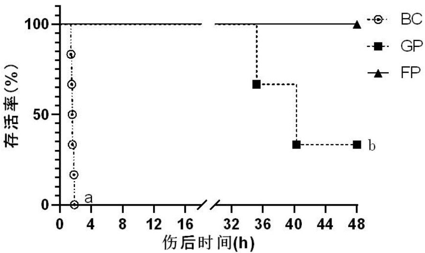 | FP组与BC组比较,aP < 0.01;FP组与GP组比较,bP < 0.01 图 2 各组猪Kaplan-Meier生存曲线 Fig 2 Kaplan-Meier survival curve of swines in each group |