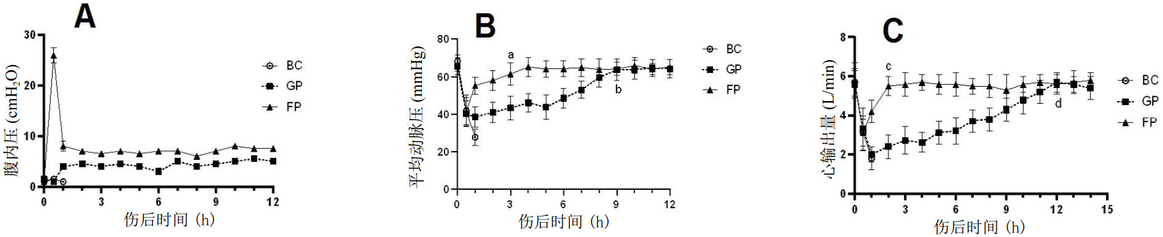 | A:BC, GP两组腹内压未见明显变化;FP组泡沫填塞后腹内压迅速升高后迅速恢复至基线水平;B:三组建模后平均动脉压均迅速降低,GP组缓慢回升,伤后9 h恢复(与基线水平相比,aP > 0.05);FP组伤后3 h恢复(与基线水平相比,bP > 0.05);C:三组建模后心输出量均迅速降低,FP组伤后2 h恢复(与基线水平相比,cP > 0.05);GP组缓慢回升,伤后12 h恢复(与基线水平相比,dP > 0.05) 图 3 腹内压、平均动脉压及心输出量变化 Fig 3 Changes of IAP, MAP, CO of swines in each group |