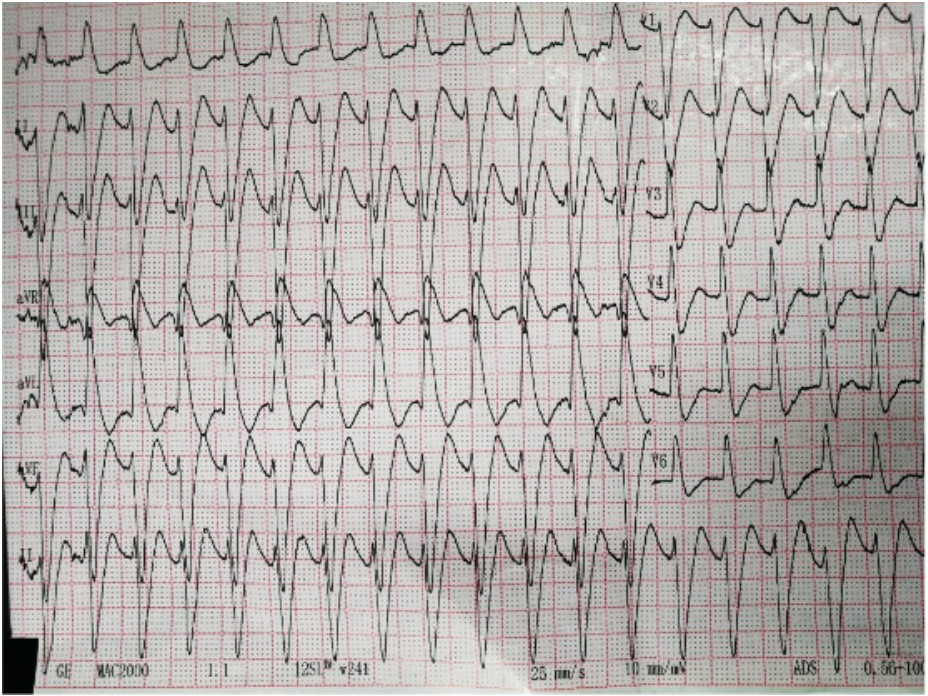 图 1 患者2019-12-03 12:53心电图示室性心动过速 |