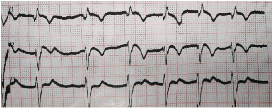 图 2 患者2019-12-03 13:30心电图示T波倒置 |