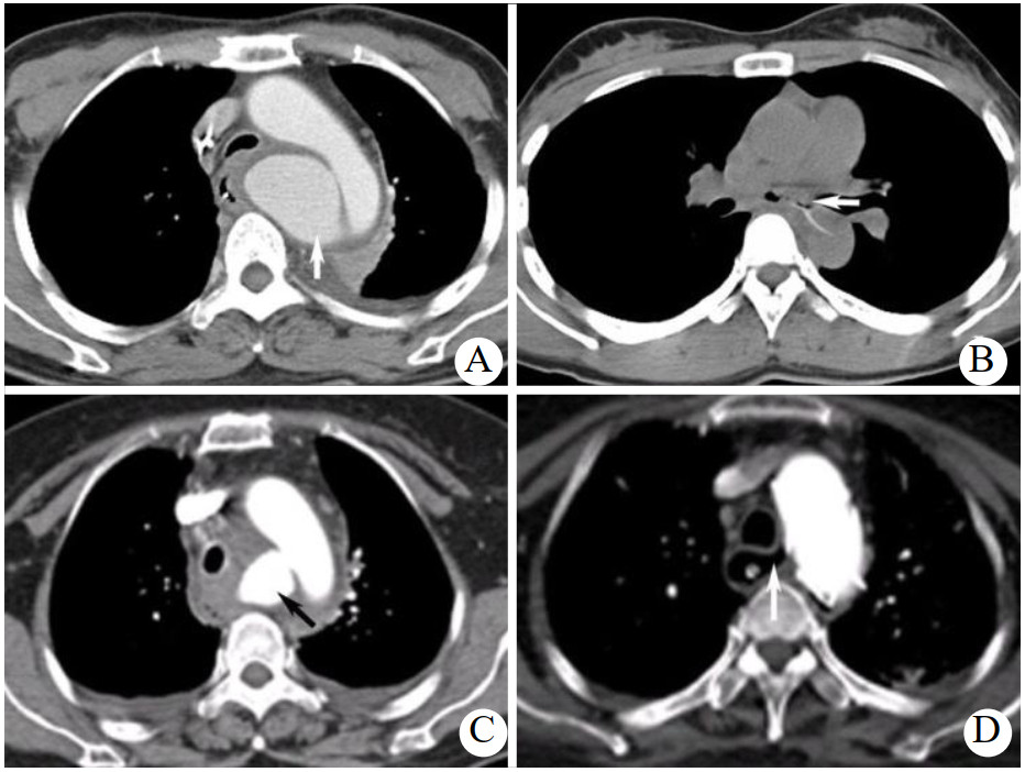 | A: 患者1增强CT显示主动脉弓内后方假性动脉瘤形成(箭头示);B: 患者2 CT平扫显示食管内异物刺穿食管壁,向左后刺入胸主动脉(箭头示);C:患者3 CTA显示主动脉弓假性动脉瘤形成(箭头示);D:患者3 CTA可见明显的AEF存在,瘘管非常清晰的与TEVAR术后的主动脉相连(箭头示) 图 1 三例患者增强CT结果 |