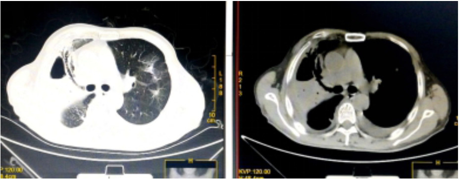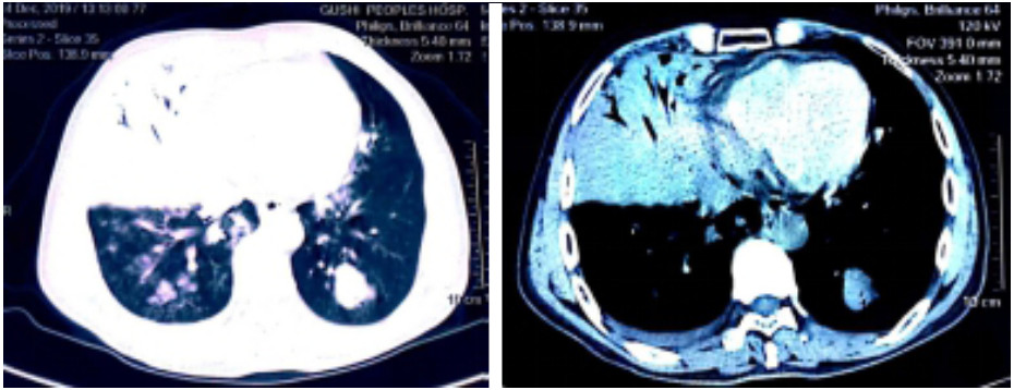 | 图 1 患者2019年12月14日胸部CT结果(右肺上叶及中叶大片实变影,左肺上下叶可见散在团块状密度增高影) |