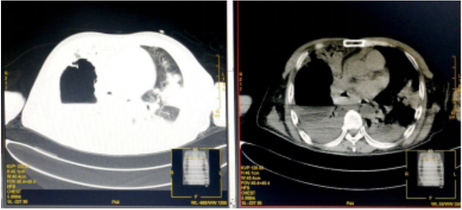 | 图 2 患者2019年12月19日胸部CT结果(双肺散在多发感染性病变,右侧为著;右肺空洞伴气液平面;右侧胸腔积液) |