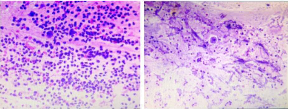 | 镜见炎症细胞、吞噬细胞及菌丝样物,未发现恶性细胞;HE染色(左40×,右10×) 图 3 患者2019年12月20肺泡灌洗液病理结果 |