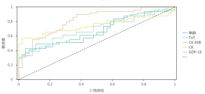 对CK-MB、CK及GDF15与SD相关性进行logistics回归分析,如表 5所示,CK及GDF15会对SD产生显著的正相关。CK-MB与SD相关性小。