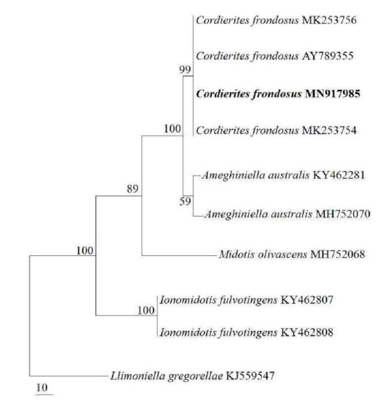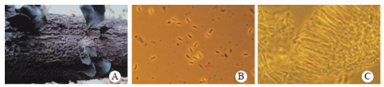2.4 蘑菇鉴定形态学鉴定结果:子囊盘宽1~2.5 cm,黑褐色至黑色,干后墨黑色,盘状、浅杯状、花瓣状至不规则的片状,边缘波曲,干后脆而硬,具小短柄或无。子囊袋状,40~45µm × 3.8~5 µm;子囊孢子圆柱形至腊肠形,平直至稍弯曲、无色、薄壁、光滑,5.2~7 µm × 1.3~1.7 µm(图 1)。分子生物学鉴定结果:图 2为基于ITS序列构建的系统发育树拓扑结构图。本次事件的标本与3条来自于Genbank的叶状耳盘菌(Cordierites frondosus)的序列聚类到同一分枝,获得极高支持率(图 2, MP =99%)。因此,该起事件的标本鉴定为叶状耳盘菌。