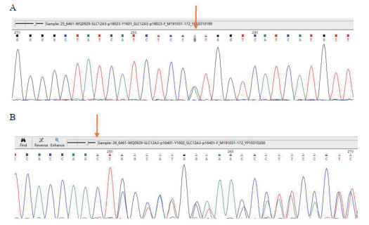 | 图 2 患者基因分析结果: A.SLC12A3基因携带一个c.1732G > A(p.Val578Met)杂合突变,为错义突变(箭头);B.SLC12A3基因携带一个变c.1664_1668delCGCCT(p.Ser555fs)杂合突变,为移码突变(箭头) |