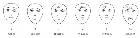 2.2.4 评估腹痛严重程度应快速、客观地评估急性腹痛严重程度,以指导适当的腹痛管理。急性腹痛严重程度的评估是主观的,与临床表现、实验室参数或诊断性影像学检查结果无关。与患者自我疼痛评估结果相比,医务人员常常低估了患者疼痛严重程度[50-51]。目前临床上已有多种简单且可重复的疼痛严重程度评价量表,用于指导急性腹痛患者评估自身疼痛感知,如视觉模拟量表(visual analogue scale,VAS)、言语评价量表(verbal rating scale,VRS)、数字评价量表(numerical rating scale,NRS)和面部疼痛表情量表(faces pain scale-revised,FPS-R)等。由于具有易用性、错误率低、接受度以及灵敏度高等优势,临床上NRS在成人疼痛评估时表现最佳[52-54](图 2),但其对存在意识障碍、视力受损和语言功能障碍的患者使用具有明显局限性[43]。因此,对此类患者可选择FPS-R,如Wong-Baker面部表情量表,其由六张从微笑到流泪的不同面部表情图组成(图 3)。但该方法易受患者情绪、文化、教育程度以及周围环境等因素的影响,使用时需要紧密结合临床具体情况。Wong-Baker面部表情量表的临床评估结果等同于NRS。