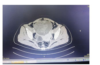 | 图 1 患者2019-05-14全腹CT平扫+增强结果(示双附件区及下腹腔多发占位) |