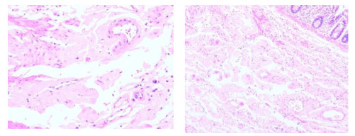 | 图 1 患者切除肠段结肠黏膜下层HE染色(A:×50;B:×100) |