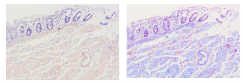 | 图 2 患者切除肠段结肠黏膜下层免疫组化染色[A:刚果红(+)×50;B:Masson(+)×50] |