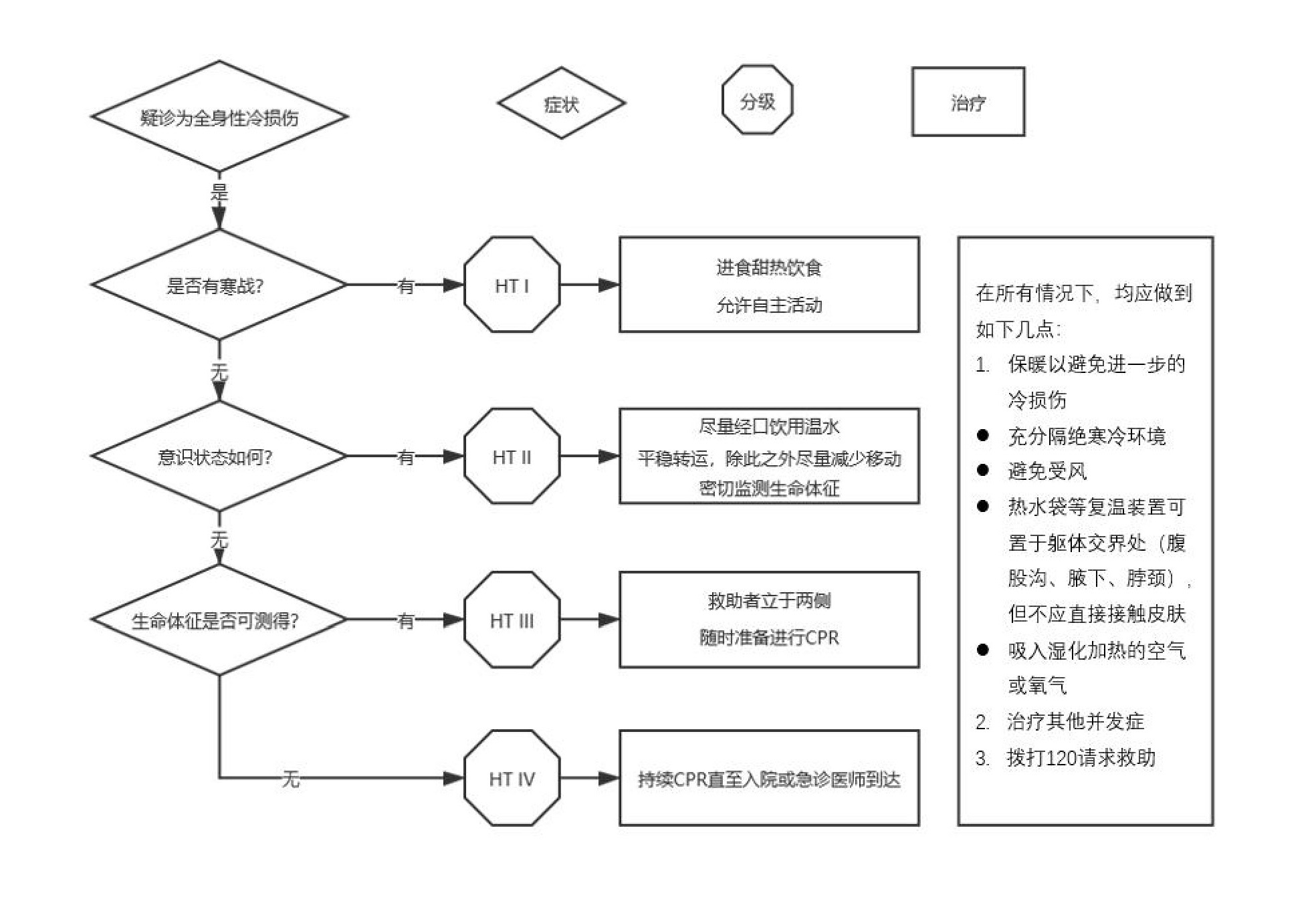 若患者被疑诊为全身性冷损伤,应立即脱离寒冷环境并予加用衣物或保温毯等进行保温。同时根据上文所介绍的瑞士分级方案进行评估,对于不同等级的全身性冷损伤患者给予相应处置(见图 1)